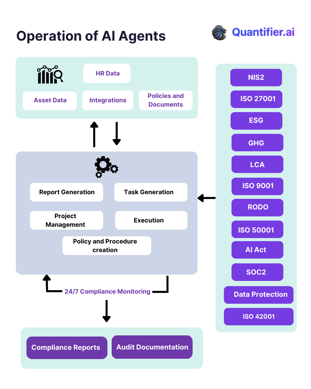 An AI Agent in Quantifier is an autonomous, intelligent system that supports end-to-end compliance management. It operates as a digital expert running in the background, monitoring regulations, data and processes in real time.