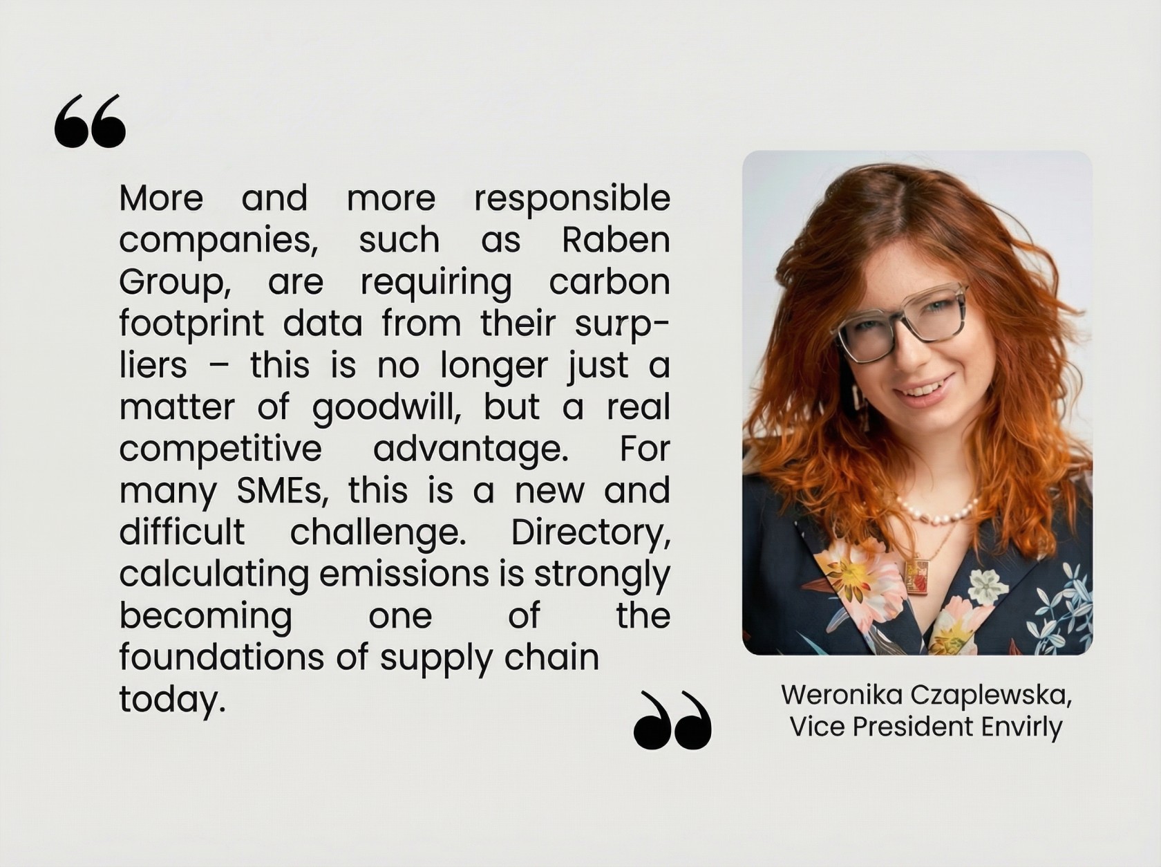Carbon footprint measurement by suppliers has become one of the pillars of the supplier financing programme of Raben Logistics Polska, which supports carriers in maintaining liquidity. From this year, the programme is linked to the achievement of ESG goals. It is another sustainable finance solution successfully implemented within Raben Group companies, combining a responsible approach with tangible support for partners in the supply chain. The programme is carried out in cooperation with BNP Paribas Faktoring, BNP Paribas Bank and the technology start up Envirly by Quantifier, which provided the tool and know how.